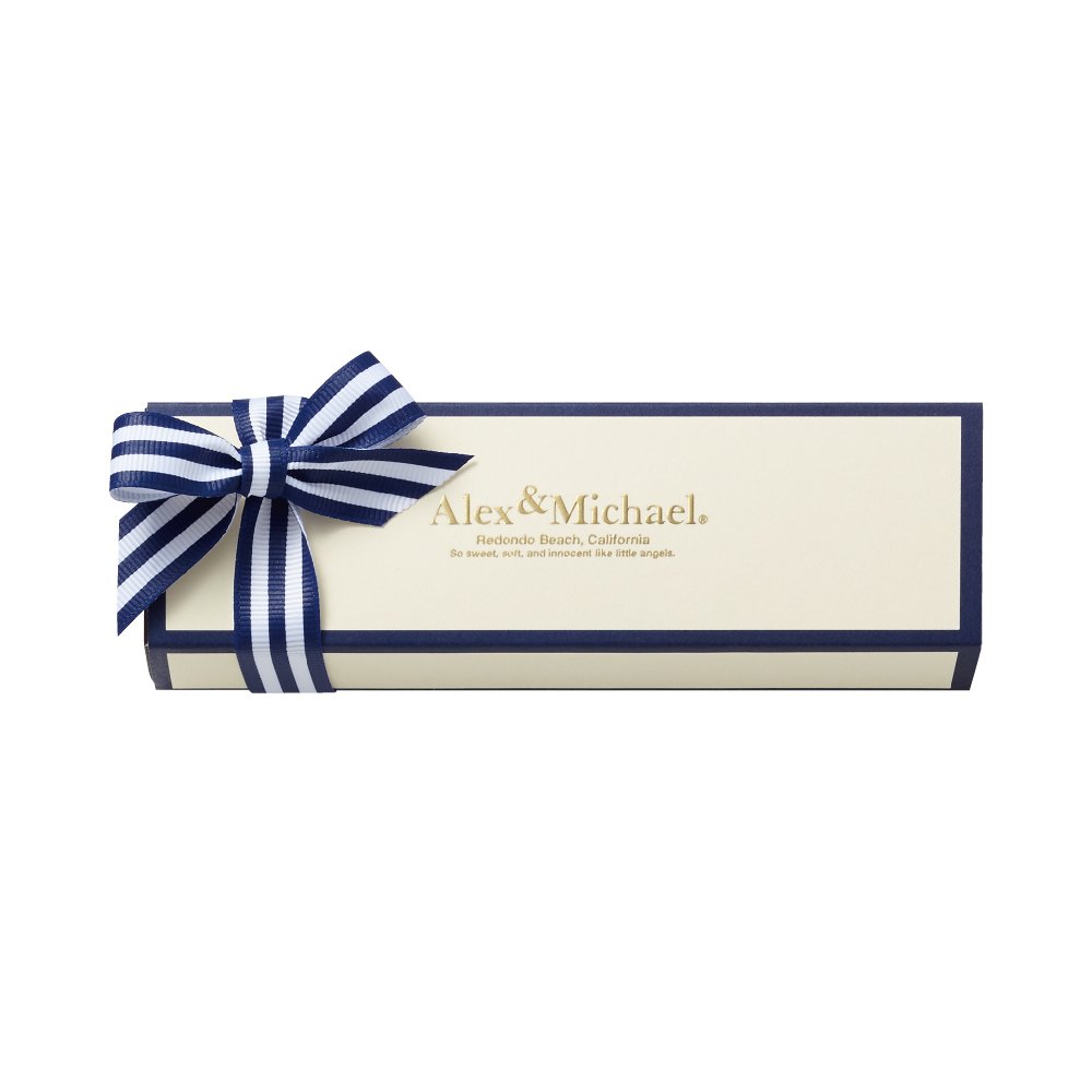 爽やかなネイビー×ホワイトのストライプリボンを結んだ、すっきり高級感のあるパッケージに、ベア型やハート型のチョコレート、ミニトリュフなどを彩りよくアソートしました。