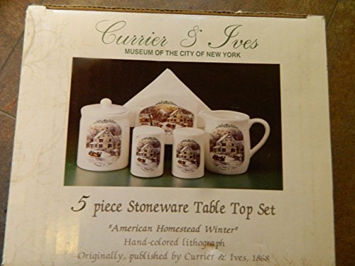 -. Title : Currier & Ives Museum of New York 5 piece Table Top Set - sugar, creamer, salt, pepper, napkin holder