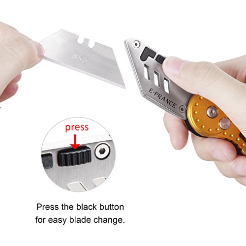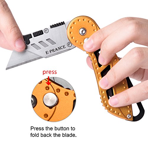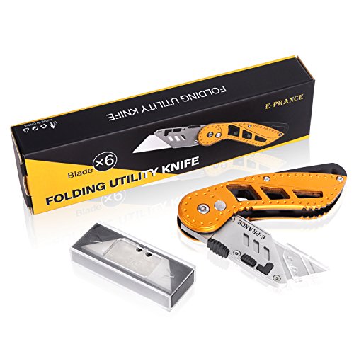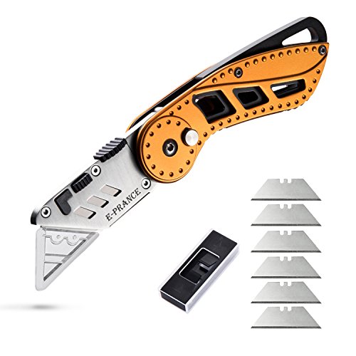 Utility Knife - Heavy Duty Folding Box Cutter, Quick Change Blades, Lock-Back Design, Aluminum Anti-slip Handle with Belt Clip, Pocket-sized, 7 Double-sided Blades Included by E-PRANCE, Orange