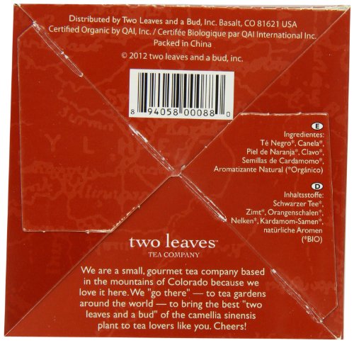 -. Binding : Grocery -. Brand : Two Leaves Tea Company -. EAN : 0894058000880 -. Feature : Whole Leaf Black Tea Sachets / Origin: India / Caffeine: Some buzz, 1/2 cup coffee / Steep Time: 5 Minutes / 15 Individually Wrapped Sachets / Black Tea / Chai is the Hindi word for "tea". In recent years chai has come to mean "spiced tea". We start with a great black tea and add pure, whole spices to ours. Try it with milk and honey. -. Label : Two Leaves Tea Company -. Manufacturer : Two Leaves Tea Company -. Model : T01015 -. MPN : T01015 -. NumberOfItems : 1 -. PackageQuantity : 6 -. PartNumber : T01015 -. ProductGroup : Grocery -. ProductTypeName : GROCERY -. Publisher : Two Leaves Tea Company -. ReleaseDate : 2006-04-19 -. Studio : Two Leaves Tea Company -. Title : Organic Mountain High Chai, 15 Count (Pack of 6) -. UPC : 894058000880