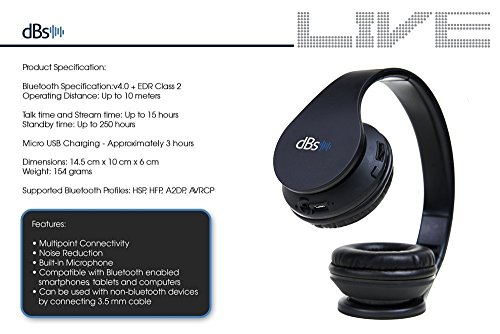 Feature : Wireless Bluetooth Headphones : Latest release Improved Bass and Loudness Larger size Micro USB charging Bluetooth 4o1 These are on ear headphones which offer good bass and loudness levels which make them the best Bluetooth headphones for work or leisure The adequate size of the earpiece and stereo sound allows reduced background noise allowing you to listen to music and calls in detail Attend to webinars and never miss a word or listen to audio books with these Bluetooth headsets / Major Bluetooth profiles supported: Being able to support HSP Headset Profile HFP Hands Free Profile A2DP Advanced Audio Distribution Profile and AVRCP Audio Video Remote Control Profile gives a wide variety of devices you can connect these best wireless headphones to These are perfect Bluetooth headphones for iPhone 5 use it as your Samsung Bluetooth earphones or for any of your android and iOS devices / Convenience The dBs Wireless Bluetooth Headsets allow automatic connection to any Bluetooth device If you have a device that doesn t support Bluetooth we have included a 3and a half mm cable to accommodate this The headphone has a built in microphone The red light will indicate that the headphone is charging Once the red light turns to blue the headphone battery is fully charged It takes almost about 3 hours for the headphone battery to be fully charged Every time the headphone is turned on it will automatically connect to the last device it was connected to Press the MFB button once and it will automatically connect to the last device it was connected to It will connect to the last device it was connected to Disconnect the headphone from the previous device first and connect it to the new one / Extensive music and talk time with Bluetooth 4o1 The dBs Bluetooth gaming headset with microphone has a music time and talk time of up to 15 hours and stand by time of up to 250 hours The possible number of activities you can do with these headphones are endless It only needs a maximum 3 hour charge time and you re off to your daily morning jogs at the park or your usual care free chat with your friends These bluetooth sport headphones are exceptional / Comfort and Style These cool Bluetooth audio headphone with 40mm audio driver dimension is suitably cushioned to let you listen to long hours of music without too much pressure on your ears Its light weight headband design is comfortable and is less of a hassle to carry around on your head The Bluetooth headset is available in black and red black and white