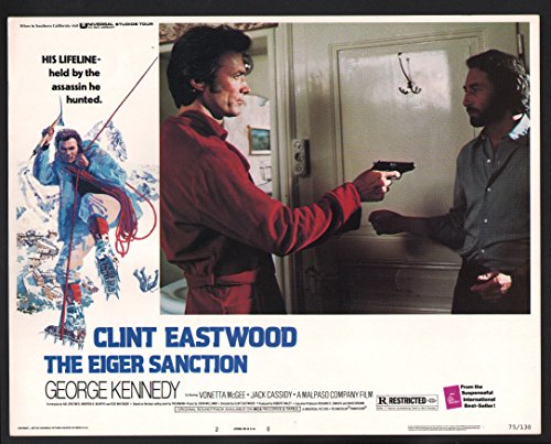 MOVIE POSTER: Eiger Sanction Lobby Card-Clint Eastwood pointing a gun at George Kennedy.