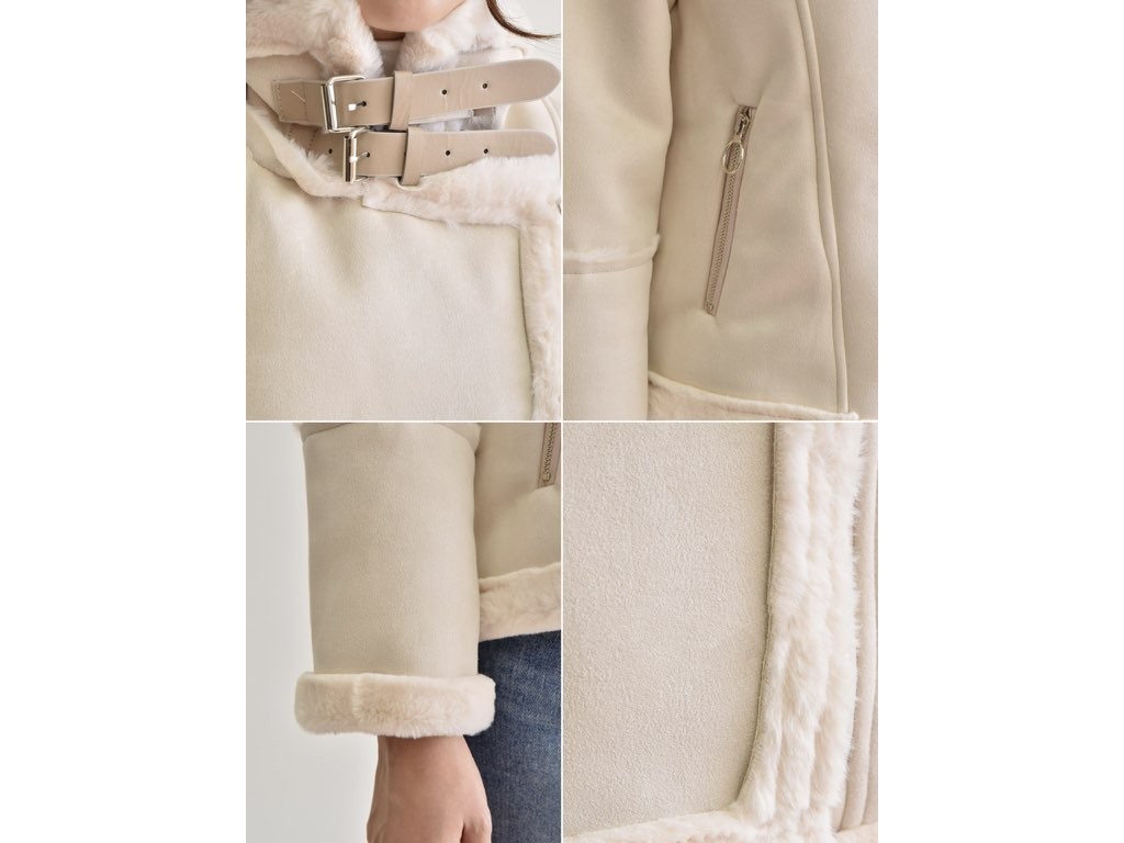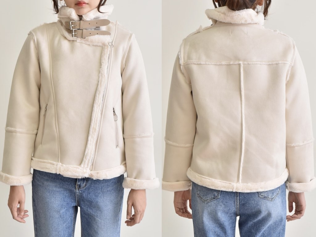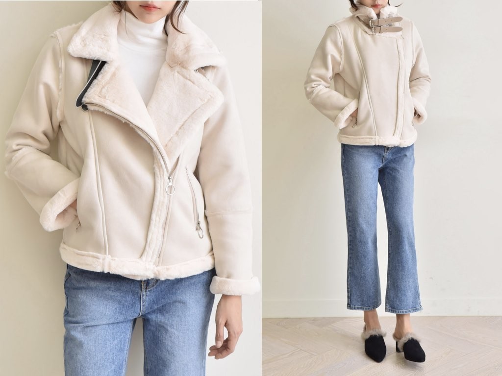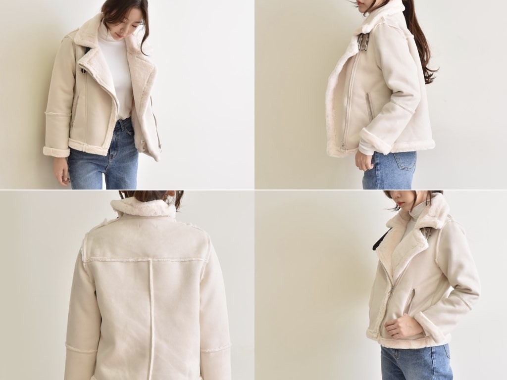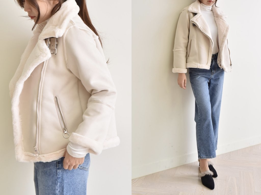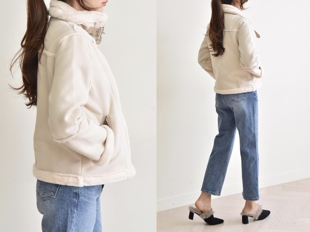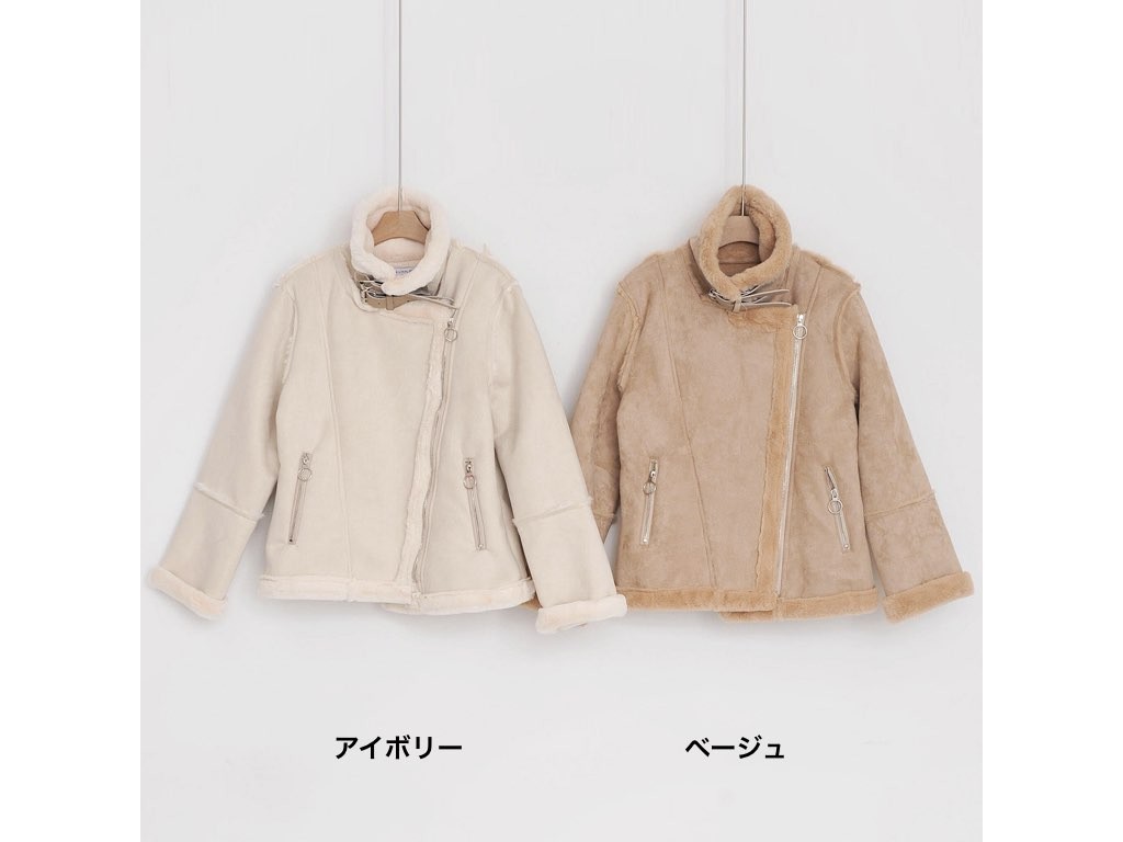 ボアのついたムートンジャケットです。ムートンジャケットをだぼっとシンプル&カジュアルに着こなすのがトレンドですね。細身のスキニーで合わせて、シルエットを変化させてみるものいいですね。商品は、とても丁寧なつくりとなっています。1.基本情報色:2色展開(アイボリー/ベージュ)サイズ:Free素材:-製造国:Korea2.サイズ情報肩幅:42cm身幅(胸断面):49cm 腕の長さ:55cm 着丈(前):59cm (サイズは計る方法に応じて±2〜3cmの誤差があります。ご了承お願い致します)モデル着用サイズ:F※着用モデル(163cm、体重47kg、足のサイズ24.5cm)3.その他の情報厚み:厚い透け感:なし伸縮性:なし裏地:あり洗濯方法:ドライ(クリーニング)[注意事項]お取り寄せ商品は、海外より仕入れるため納品まで約10日前後いただきます。また店舗でも販売しており、在庫切れになる場合もございます。ご了承お願い致します。