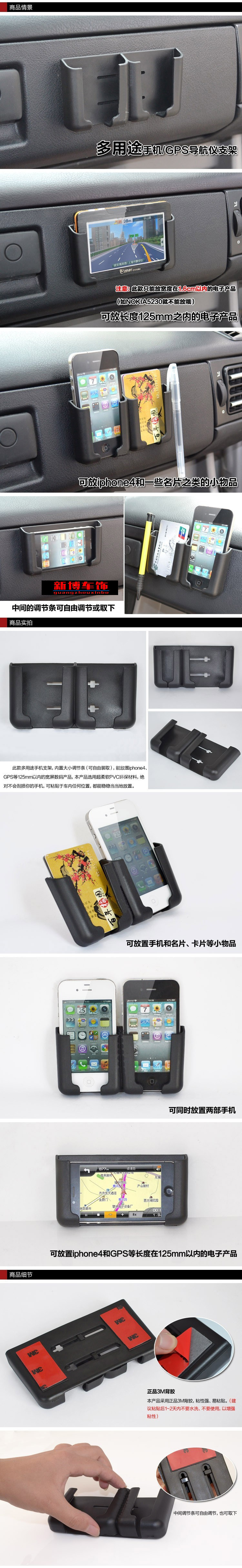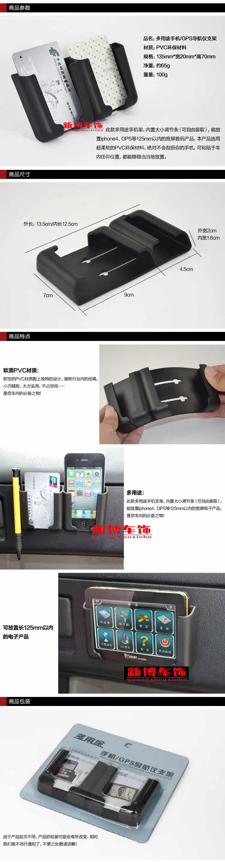 此款多用途手机支架,内置调节条(可自由装取),能放置iphone4、GPS等125mm以内的宽屏数码产品,本产品选用超柔软的PVC环保材料,绝对不会刮损你的手机,可粘贴于车内任何位置,都能稳稳当当地放置。
