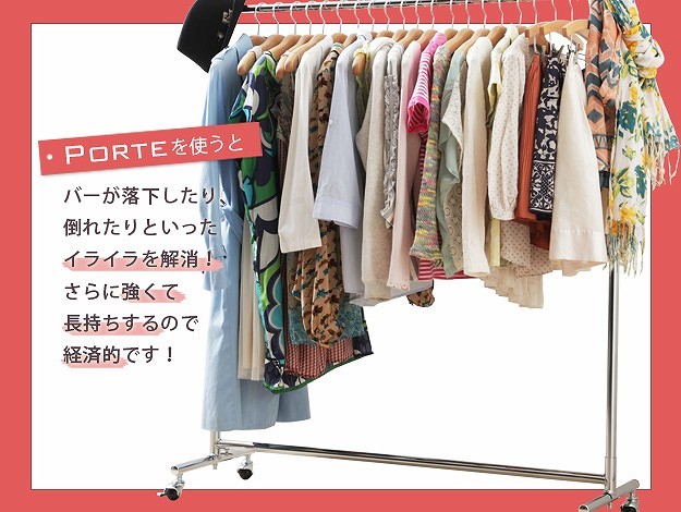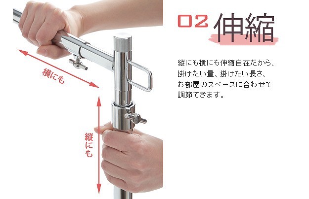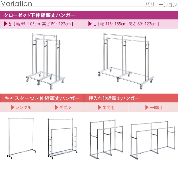 ※メーカー直送のため代金引換はお受けできません。※沖縄・一部離島は別途送料がかかります。お見積もりいたしますのでお問い合わせ下さい。頑丈伸縮ハンガーシングル。幅も高さも伸縮するので、洋服の量やスペースにあわせてサイズ調節OK。厚みのある(1.2mm)スチールを使った頑丈なつくり。固定ネジなどの部品もスチール製なので、使っているうちに接合部分が緩みグラグラして壊れたりする心配もありません。ベアリング入りのキャスターは沢山掛けてもスムースに動くうえ耐久性にも優れています。サイズ(cm):幅121~152x奥行41.5x高さ108~185cm・約6kg耐荷重:約90kg材質:スチール(クロムメッキ)組立品メーカー:株式会社ナカムラ(h0700036)
