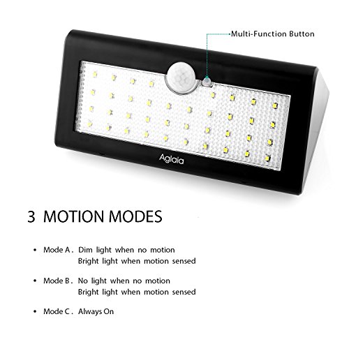 -. Binding : Haushaltswaren -. Brand : Aglaia -. EAN : 0714439491932 -. Feature : Wasserdicht: Schutzgrad IP65. Die Staubdichte und wasserfest Lampe besitzt eine hervorragende Stabilität beim kontinuierlichen Betrieb ohne Abnormität / Intelligenter Lichtmodus: Neben dem herkömmlichen stabilen Lichtmodus für die Nacht, besitzt unsere Lampe zudem zwei intelligente Lichtmodi / Sehr helles Licht: Die Solarlampe mit einer Stärke von 500 Lumen mit 38 hochwertigen LEDs ist sehr hell und kann einen großen Bereich beleuchten / Große Kapazität: Die Solarleuchte mit einem 2.5W Solarpanel kann schnell aufgeladen werden. Die Kapazität beträgt 4000mAh / EinfacheMontage: Kein Kabelsalat! Hängen Sie die Lampe einfach mit einem Nagel an die Wand. Es ist Umweltfreundlich und es ist keine externe Stromversorgung erforderlich -. Label : Aglaia -. Manufacturer : Aglaia -. ProductGroup : Küche & Haushalt -. ProductTypeName : HOME -. Publisher : Aglaia -. Studio : Aglaia -. Title : Aglaia LED Solarwandleuchte mit Bewegungsmelder, 38 Stüke LED 500lm Drahtlose Wertefeste Außenleuchte, 3 Modi für Wand Garten Terrasse Treppen (LT-W5) -. UPC : 714439491932