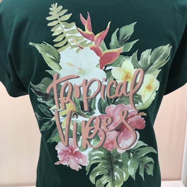 뒷모습이 더 여름여름스런 트로피컬의 향연!앞모습은 깔끔한 기본으로 넥라운드가 예쁘게 파여있어 깔끔하고 소매롤업으로 한결 발랄함과 활동적인 느낌을 주었습니다.뒷태가 시원한 트로피컬 프린트로 화려하면서도 큰 프린트로 등라인이 한결 예뻐보이네요:^^아더 칼라는 화이트,카라멜이 있고 다른 카테고리에서 만나실 수 있어요::)