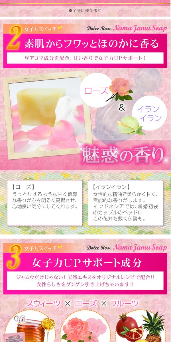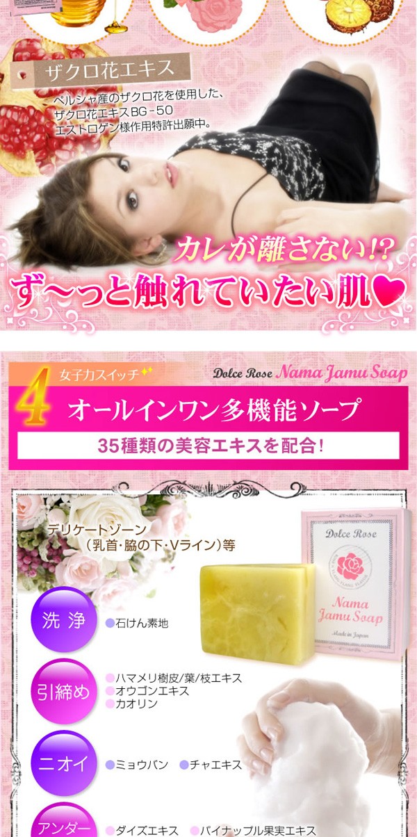 石ケン素地、カリ石ケン素地、コカミドプロピルベタイン、水、オリーブ油、カミツレ油、ジグリセリン、BG、アロエベラエキス、オタネニンジンエキス、甘草エキス、ミョウバン、ハマメリス樹皮/葉/枝エキス、ダイズエキス、パイナップル果実エキス、スクロース、ローヤルゼリー、ホホバ油、月見草油、ヤシ油、シコンエキス、スクワラン、トコフェノール、ユキノシタエキス、オウゴンエキス、ソウハクヒエキス、ユズエキス、カワラヨモギエキス、マロニエエキス、 ヒアルロン酸Na、ザクロエキス、陳皮、チャエキス、ローズ油、グリセリン、ツバキ油、ハチミツ、ソルビトール、加水分 解コラーゲン、ゲッケイジュ果実油、セラミド2、アスタキサンチン、カオリン、イランイラン油、香料 |