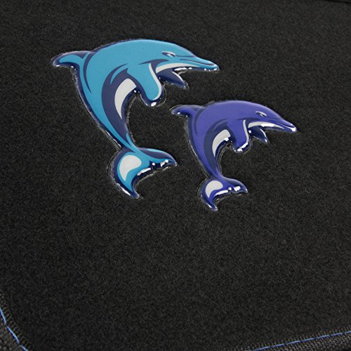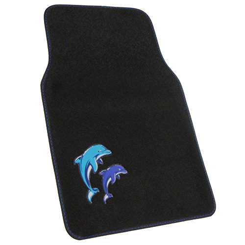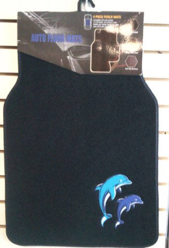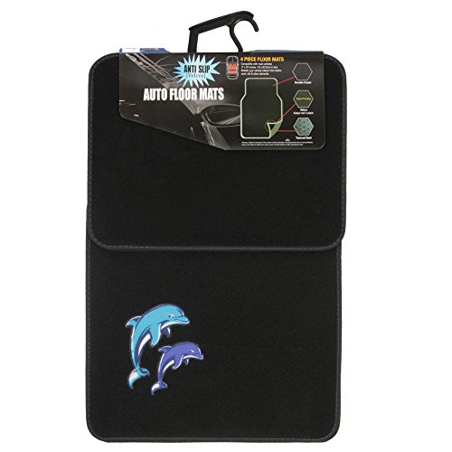 Drive in style with a set of anti-fade coloring dolphins floor mats. Quality nylon carpet with scratch resistant TPR patch color design. Protects vehicle's carpet against spills, stains, dirt and any debris. Non-Skid nib backing keep floor mats in place. Universal shape to fit most cars, SUVs, trucks and vans set includes 2 front mats (27x17 inch.), 2 back mats (17x13 inches).