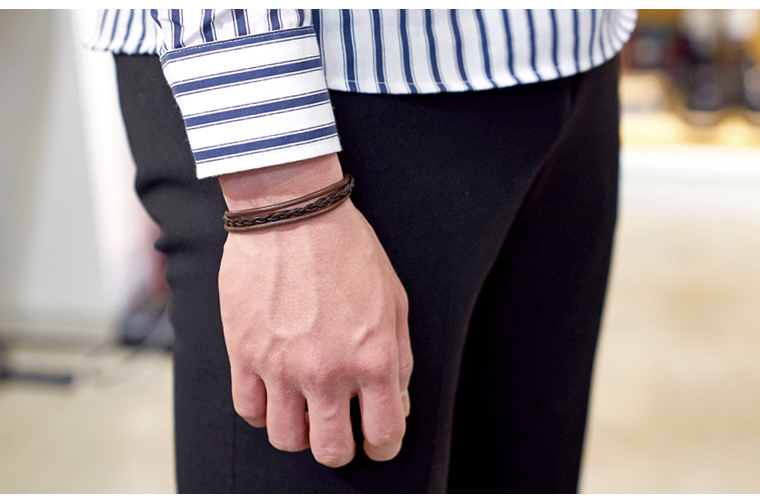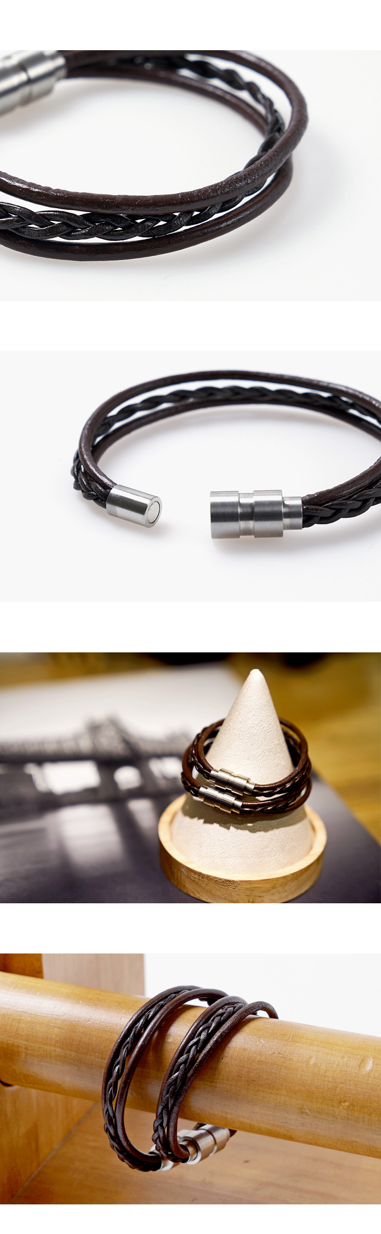 두가지 타입의 가죽스트링을 믹스해 제작된 가죽팔찌입니다. 가죽스트링이 자연스럽게 레이어드 연출이 되도록 디자인 되어 단품으로 가볍게 착용하기 좋습니다. 고급 스테인레스장식과 이태리 수입가죽을 이용해서 품질을 최대한 올렸습니다. 자석형 버클로 탈착도 편하게 할 수 있도록 했습니다. 은은한 톤온톤 컬러의 가죽과 반광 메탈장식이 잘 어우러져 클래식한 느낌을 잘 살려낸가죽팔찌입니다. 스테인레스 장식은 변색이나 알러지 걱정이 거의 없이 오래도록 사용이 가능해 본인 뿐 아니라 선물용으로 사용하시기에 좋습니다. 4계절 착용하기 좋은 디자인으로 캐주얼한 코디는 물론 댄디한 코디에도 잘 어울리는 디자인입니다. 남녀공용으로 착용하기 좋고, 사이즈도 남성용, 여성용, 주문제작까지 가능하기 때문에 커플용 팔찌로 추천드립니다.