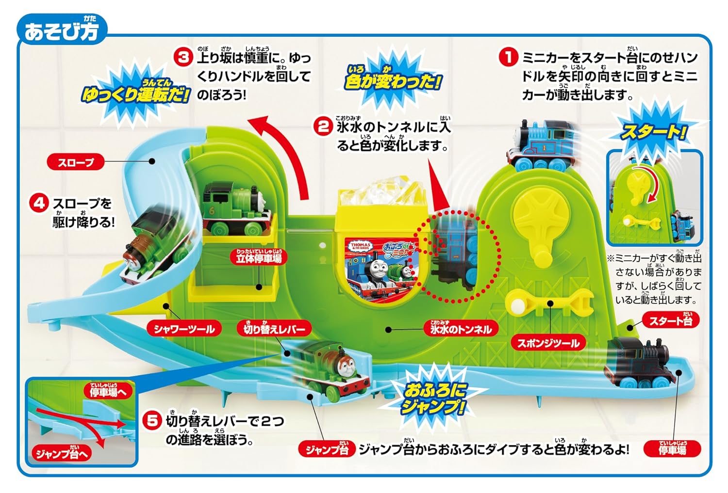 ハンドルを回すとトーマスとパーシーが色変わりして、おふろのコースを走ります! 氷水に入れるとトーマスは「石炭で真っ黒」に、パーシーは「チョコレートまみれ」の状態になります。お湯と氷水で何度でも繰り返しミニカーの色が変わります。おふろでもお部屋でも遊べます。[セット内容]コース本体、ミニカー2台(トーマス、パーシー)、シャワーツール、吸盤2個