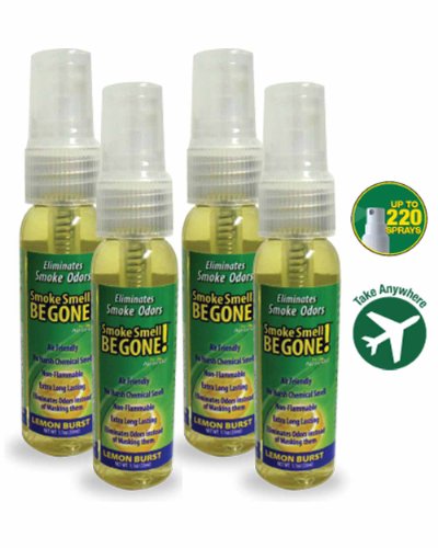Studio : Airavida Publisher : Airavida Binding : Health and Beauty Product Description Four [4] brand new 1.1oz bottles of Smoke Smell Be Gone by Airavida. Quickly gets rid of cigarette, cigar, tobacco and other smoke smells in your car or house through its blend of natural herb and weed extracts. You no longer have to search for a smoke odor eliminator, buy a smoke eater or get a smoke odor removal team, just spray Smoke Smell Be Gone and the smoke smell is gone. Instantly and permanently, Smoke Smell Be Gone is free of harmful chemicals and phalates unlike Ozium and other sprays. 0