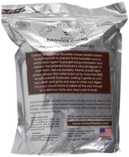 Tartar Shield Soft Rawhide Chews are coated with a unique mixture containing sodium tripolyphosphate to prevent tartar formation and an antimicrobial agent to prevent plaque formation and malodor