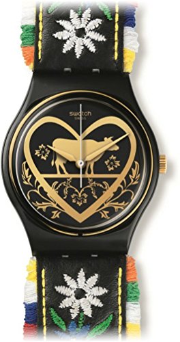 -. Title : Swatch GB285 Die Glocke Black Dial Floral Embroidery Leather Women Watch NEW