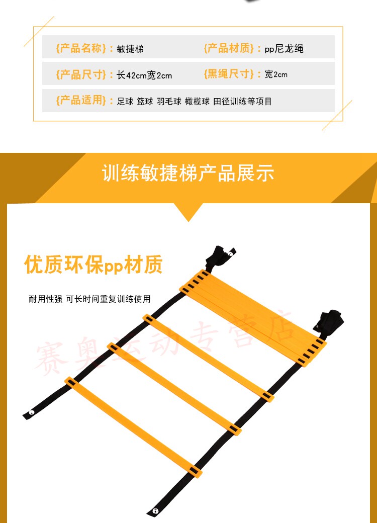 Features:1. 100% brand new and high quality.2. 8-rung heavy and durable design can be used for years of time.3. 51cm from rung to rung.4. Adjustable flat plastic rungs for safety according to your needs.5. Durable and strong nylon straps and rungs.6. The rung is extendable and in good toughness, so that you can bend it at your will without breaking it.7. Connecting buckles on the two sides of the straps which allows you to extend the training ladder at your will.8. The speed or agility ladder is a device to improve feet speed, agility and co-ordination. High-intensity training can be doing both indoors and outdoors.9. Suitable for athletic training, football, basketball, tennis, badminton, rugby and so on. It is also suitable for agility training of teenagers.10. Space-saving, portable and convenient to use.11. It will be also a good gift for teenagers and friends.Specifications:Material:PP materialRung color: YellowLength: Approx. 400cm/157inchWidth: Approx. 51.5cm/20.2inchLadders Quantity: 8