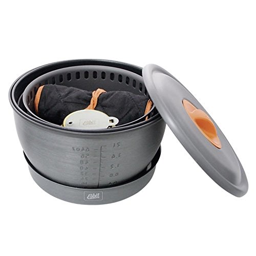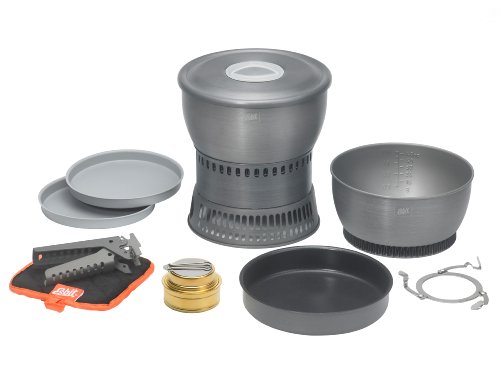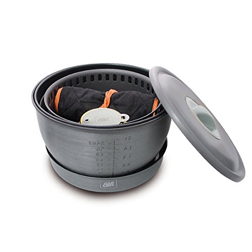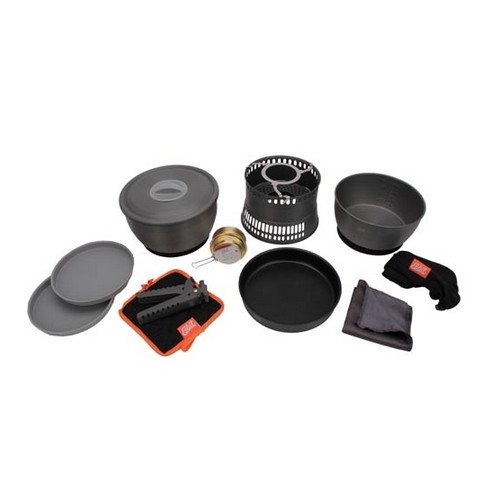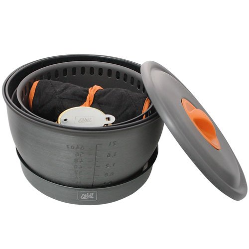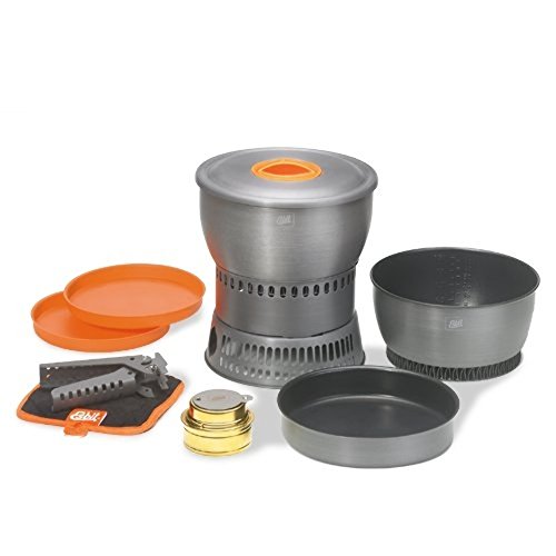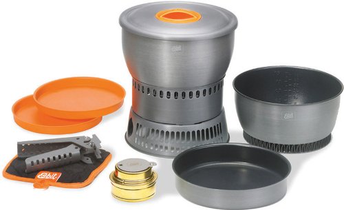 Studio : Industrial Revolution Publisher : Industrial Revolution Binding : Sports Product Description The Esbit 12-Piece Alcohol Stove Camp Set is constructed from extremely light, hard-anodized aluminum. The camp set includes a 1.8 liter pot, 2.35 L pot, potholder, lid with plastic grip, frying pan, 2 plastic plates, gripper, wind deflector, micro fiber cloth, brass alcohol burner and mesh storage bag. The cooking pots have heat exchanger on the bottom that promotes higher fuel efficiency. The cooking pots also feature volume indicators in liters/oz. The 7.25 inch frying pan has a textured bottom for heat retention that distributes heat evenly. The Esbit Alcohol Burner is a extremely durable and efficient stove; constructed of brass, it weighs only 3.25 oz. Stove comes with a flame regulator with a fold-away handle. The stove also feature a screw top with rubber seal that retains fuel in the stove. 0