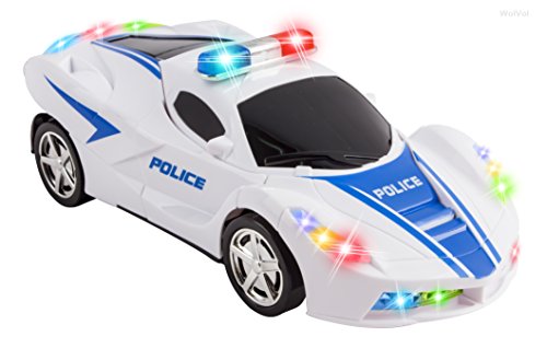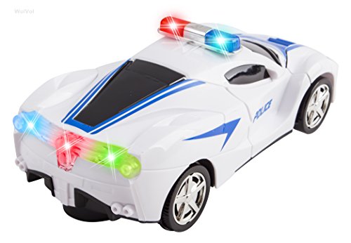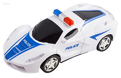 -. Binding : Toy -. Brand : WolVol -. EAN : 0712038654826 -. Feature : 2-in-1 Robot Transformer Police Car with Flashing Lights and Loud Sounds / Bump and Go Action, runs on smooth surfaces / It will change directions and run when it bumps into something / Great robot car toy for boys and girls who are obsessed with robots and cars / police cars / 3 AA batteries required (not included) -. IsAdultProduct : 0 -. Label : WolVol -. Manufacturer : WolVol -. MPN : unknown -. PartNumber : unknown -. ProductGroup : Toy -. ProductTypeName : TOYS_AND_GAMES -. Publisher : WolVol -. Studio : WolVol -. Title : WolVol Transformers Robot Police Car Toy with Lights and Sounds for Kids, with Bump and Go Action -. UPC : 712038654826