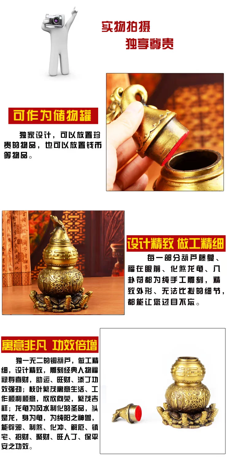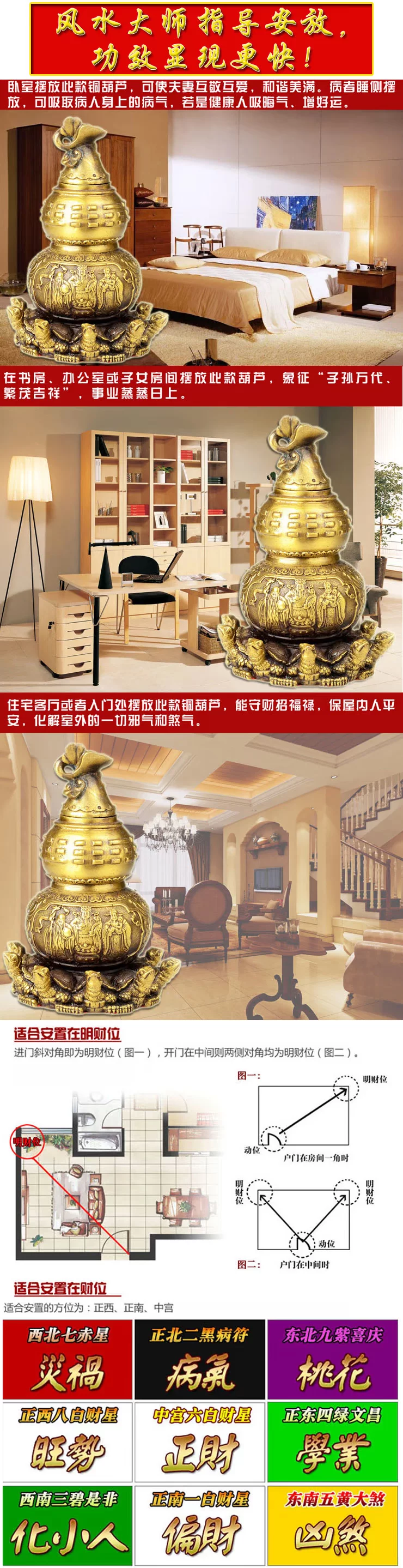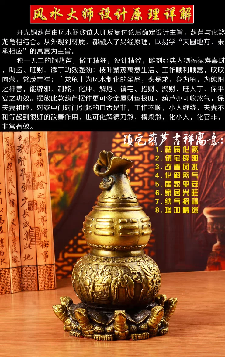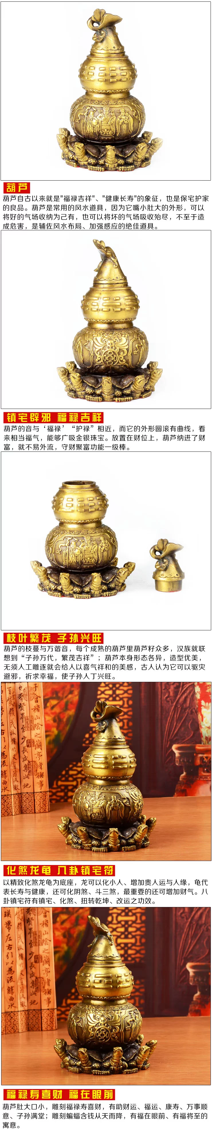 | 【葫芦】 铜葫芦是家家都应该摆放的极佳之品! “葫芦”同“福禄”谐音,象征富贵,有吉祥、纳福、长寿之意,摆放在房子财位可以对于家人的财气有帮助,摆放在夫妻床头对于感情融洽有一定的益处,葫芦还象征平安、顺利、如意;另外有许多与医药相关的企业都以葫芦为标志,所以还有健康长寿、行善积德的象征意义。 【特别强调】 葫芦之所以具有那符招财、增感情、除病气化煞的功效,其原理为“内空外圆、开口聚气”,因此葫芦必须“内空、开口、上盖”才具备对应功效。 各位缘主,风水铜器大部分采用砂石模具铸造,成型后敲掉模具材料后成空心,因成本限制,造型都或多或少不太严谨,部分铜器内会留有模型材料等,属于正常现象,敬请知晓。阿弥陀佛。 【葫芦的相关介绍】 由于葫芦的曲线形状和太极阴阳分界线相近,在内里并有隔绝气场的功能,而且外形嘴小肚大,能讲好的气场收纳为己有,也可以将坏的气场吸收殆尽,因此葫芦在风水上是一种常用的镇宅化煞吉祥物。 风水上使用铜质的葫芦和天然葫芦(冰晶葫芦、玉石葫芦、木葫芦、干葫芦瓜),分别会有两种不同的效用,但都会保健康,化煞气。 1、助健康运,葫芦是过去师傅装盛仙丹妙药的法器,它能纳福增寿、去除灾厄,并且吸取空间中的秽煞之气,恢复原本的干净清晰。 1)、在患者的床头放置三个铜葫芦,对身体不好、身体抱恙的人,能够缓和症状,让身心都好过一些。 2)准备两个铜葫芦,一个挂在大门背上,另一个则挂在厨房门上或 厨房内的瓦斯炉附近,可保全家安康。 3)九宫飞星中的五黄星和二黑星等都和欠安有极大关系,它们五行都是属土。因为铜器有化解土煞的功效,所以在五黄、二黑星流年飞临方位挂上铜质的葫芦,对家人健康有一定的帮助。 2、守财聚富,葫芦谐音“福禄”,加上它的外形圆滚有曲线,看来相当福气,加上入口小、肚量大的特色,仿佛能够广吸金银珠宝,且不易外流。因此在财位上摆放或悬挂铜葫芦,有助于守财聚富。 3、化解梁煞,如天花顶上的横梁正对大床,厅中梳化或书房的座位等,而居住者又长时间在该处休息或工作,便会造成横梁压顶之局。此煞会引起头晕、头痛、失眠以及其它的一些脑部疾病,在该横梁上或者在横梁下方安放一个铜质葫芦,便可以化解横梁压顶之局。 4、配偶和睦,如果双方感情淡薄、经常为小事争执,可以在床头摆放或悬挂铜葫芦,有助于配偶双方增进感情。 5化解声煞,住宅在机场、车站、高速公路附近,或附近有建筑工程,噪杂声都会令人心绪不宁、烦躁不安和精神无法集中,这就是声煞。在床头旁放置天然葫芦(冰晶葫芦、玉石葫芦、木葫芦、干葫芦瓜),虽不能令声音减细,但可舒缓声煞,令听者心境较为平静。 6、化解官门煞、阴邪煞、独阴煞,如果屋宅的窗户或大门向正医院、殡仪馆、坟场或屠场,便是犯了阴邪煞;见到警署、监狱是犯了官门煞;而面对垃圾场、公厕等是犯了独阴煞。这些都会有损居住者的财运、事业、健康和情绪,也对其人际关系有坏影响。解决方法是在迎接这些煞气的窗户或大门上,悬挂天然葫芦(冰晶葫芦、玉石葫芦、木葫芦、干葫芦瓜)即可。 7、保行车平安,不论是铜葫芦还是天然葫芦(冰晶葫芦、玉石葫芦、木葫芦、干葫芦瓜),只要悬挂在汽车后视镜或放置在汽车内,都对保行车平安有帮助。 |