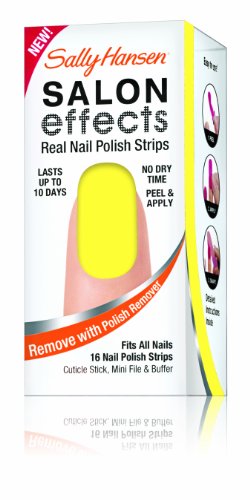 Sally knows nails are the best accessory. Introducing Sally Hansen salon effects, real nail polish strips that gives you a salon fashion manicure anytime, any place. It wears like nail polish because it is nail polish. There is no dry time so you're ready to go. Salon effects lasts up to 10 days and removes easily with nail polish remover. Just peel, apply and file. Accessorize your nails with neons, glitters, and high fashion patterns with salon effects-24 fashion-forward styles to choose from.Feature