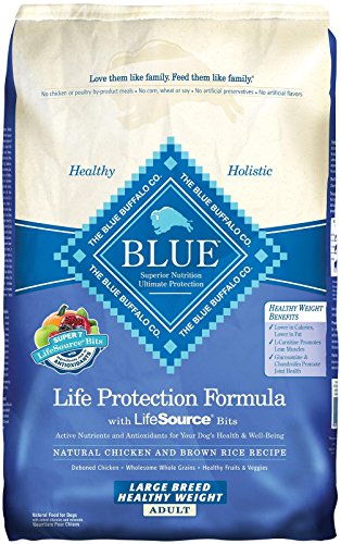 -. Binding : Misc. -. Brand : Blue Buffalo -. Feature : Holistic healthy weight dog food specially formulated for large breeds / Reduced calories and fat for effective weight control / Natural dog food features unique LifeSource Bits / Supports a healthy immune system with vitamins and chelated minerals / Formulated with glucosamine and chondroitin for healthy joints - ideal for large breeds -. Label : Blue Buffalo -. Manufacturer : Blue Buffalo -. PackageQuantity : 1 -. ProductGroup : Pet Products -. ProductTypeName : PET_SUPPLIES -. Publisher : Blue Buffalo -. Studio : Blue Buffalo -. Title : Blue Buffalo Chicken & Brown Rice Large Breed Healthy Weight Adult Dog Food