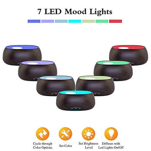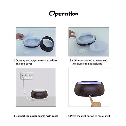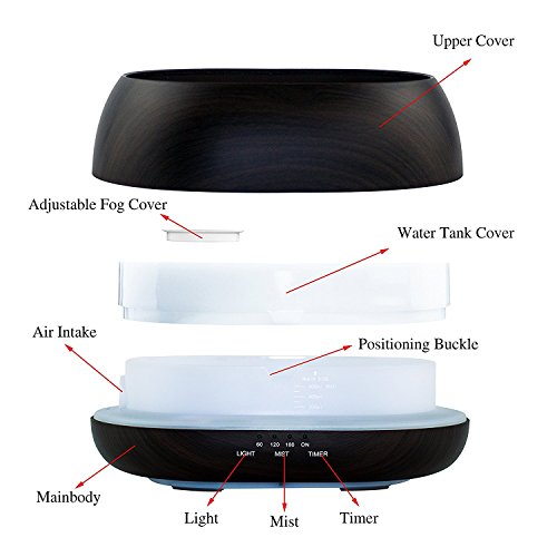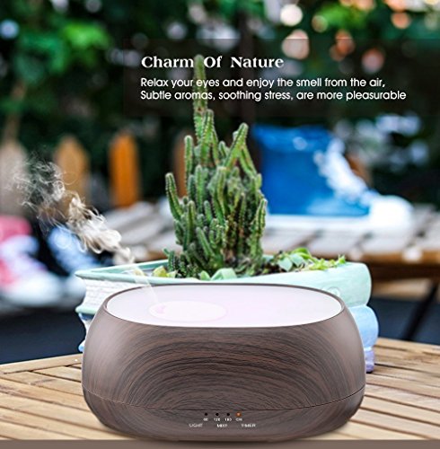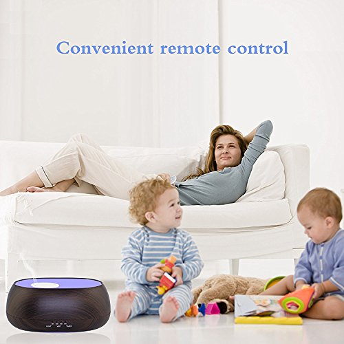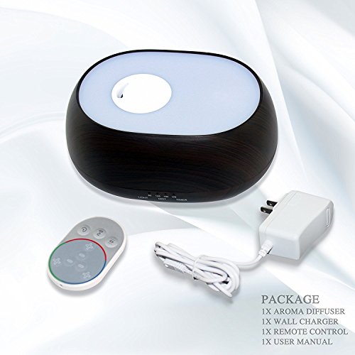 500ML modern quiet diffuser with wood grain and remote control looks very natural and classic. 8 LED color changing light adjustable and cool mist swirl,it likes drink the fountain of the sky, breath the immortal gas.Perfect for Health care Home Office Bedroom Yoga Spa