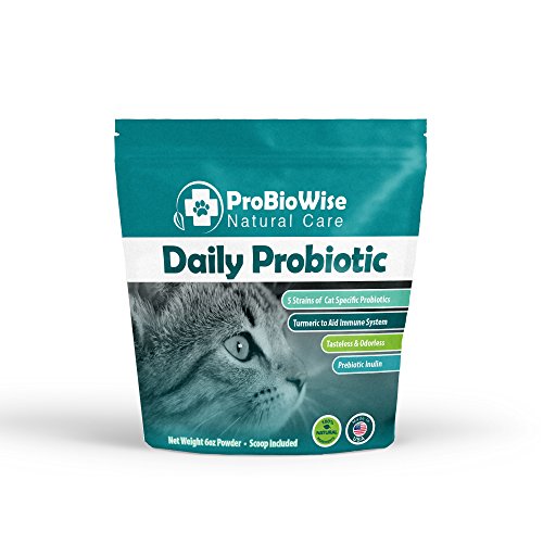 -. Feature : DAILY PROBIOTIC WITH PREBIOTIC INULIN - Our natural probiotics for cats contains Prebiotic Inulin to promote the good bacteria in your cat's stomach, inhibits bad bacteria and boosts the immune system, especially after antibiotics. The body's bacteria use Inulin to nourish and grow, which removes toxins and helps nutrients be absorbed better. ProBioWise pet probiotic provides relief from common cat allergies such as eye and skin conditions that may cause suffering and discomfort. / ALL NATURAL INGREDIENTS - Ensuring your furry friend receives the best feline probiotic is important. Made in the USA with 100% natural ingredients, our cat dry skin supplement is free of soy, yeast, grain starches and carbohydrate fillers - perfect for sensitive stomachs. Specially formulated to aid the digestive health and well-being of your cat, this amazing Acidophilus supplement supports your cat's diet by converting their food proteins into healthy digestive enzymes. / 5 STRAINS OF CAT SPECIFIC PROBIOTICS - ProBioWise Natural Care cat probiotics is formulated to provide the best relief from diarrhea, cat constipation, allergies, bad breath, itching, bloating and gas. Our unique formula contains 25 Billion CFU per pouch with 5 live strains of species specific probiotic. These powerful strains provide support for your cat's heart, liver, kidneys and urinary tract health. Prevents yeast infections and cat eye allergy and improves dry, itchy skin and dull coats. / ORGANIC TURMERIC FOR IMMUNE SUPPORT - Enriched with Organic Turmeric and Curcumin for anti inflammatory cat arthritis pain relief and made with 100% organic ingredients. Derived from Certified Organic above sea level Coral Calcium and 74 natural earth minerals, this powerful delivery of antioxidants support your cat's immunity and digestion, as well as their muscles, bones and teeth. Reduces joint inflammation, inflamed skin and joint health, stiff joints and relieves arthritis. / COMPLETELY TASTELESS AND ODORLESS - Just like us, cats need a healthy balance of flora in the gut. Our 6oz daily cat probiotic supplement contains 225 full scoops of pet probiotics powder and comes in an easy to open, re-sealable zipper pouch with enclosed scoop for hassle-free dosage. Tasteless and odorless with fast absorption, even the fussiest of cats won't mind the taste! Simply mix into wet or dry cat food to give your cat the natural and healthy life they deserve.