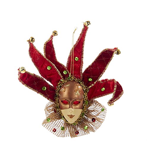 - Hat is gold trim with red extensions with bells. Jester is wearing a gold mask with red eyes.