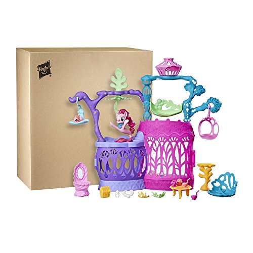 Inspired by My Little Pony: The Movie, this Pinkie Pie seapony figure has a pretty mermaid-like tail for imagining underwater adventures in her Seashell Lagoon. The playset's doors open and close to reveal rooms to play. Press the pearl-shaped button to activate lights and add water to create bubbles inside the front window of the playset, imitating scenes from Seaquestria. The Pinkie Pie figure can sit in her lounge seat or swing and rock in the hammock. Dress her up with her accessories and pretend she’s primping in front of her shell-shaped vanity. There's many ways to play with seapony Pinkie Pie and her Seashell Lagoon! My Little Pony and all related characters are trademarks of Hasbro. My Little Pony: The Movie. Copyright 2017 My Little Pony Productions, LLC. Licensed by Hasbro.Feature