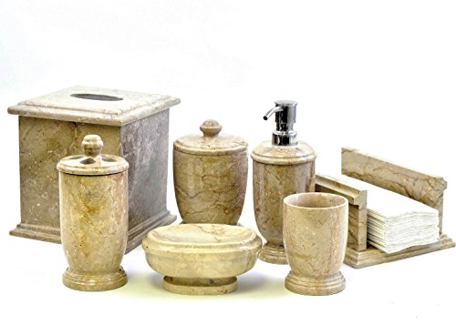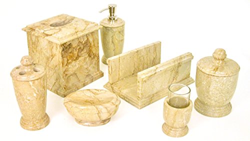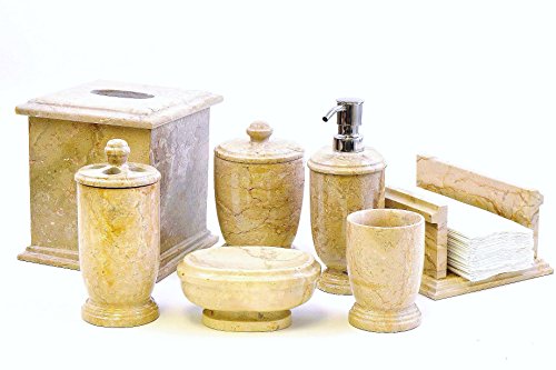 -. Feature : High Grade of Sahara Beige Marble used in crafting this bathroom accessory set / Seven pieces include one of each, tumbler, toothbrush holder, soap dish, lotion dispenser, tissue holder, towel older & canister / Part of the Bathroom Accessories of Atlantic Collection exclusively offered by Nature Home Decor / Marble & Onyx are natural stones and hence are bound to have variations in color, texture and appearance from the displayed pictures. This is considered normal and not defects / Nature Home Decor is a registered brand on Amazon and we have no distributors of our products. Hence be careful and only purchase directly from Nature Home Decor