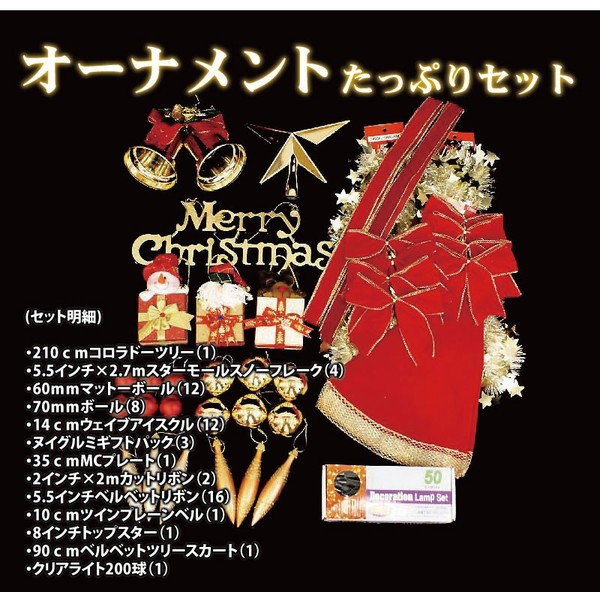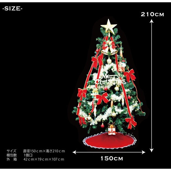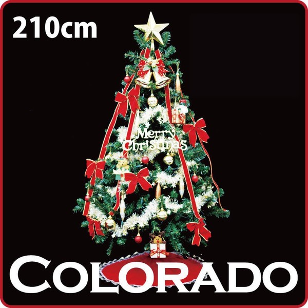 サイズ  直径150cm×高さ210cm梱包数  1個口外 箱  42cm×19cm×107cm             (セット明細)・210cmコロラドーツリー(1)・5.5インチ×2.7mスターモールスノーフレーク(4)・60mmマットーボール(12)・70mmボール(8)・14cmウェイブアイスクル(12)・ヌイグルミギフトパック(3)・35cmMCプレート(1)・2インチ×2mカットリボン(2)・5.5インチベルベットリボン(16)・10cmツインプレーンベル(1)・8インチトップスター(1)・90cmベルベットツリースカート(1)・クリアライト200球(1)昔ながらの懐かしいデザインを保ちながら新しさも兼ね備えたクリスマスツリーです。