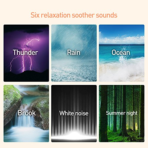 - Six soother relaxation recorded sound:Choose from White Noise, Thunder, Ocean, Rain, Summer Night and Brook. sounds are engineered to mimic the natural environment to provide the most relaxing experience possible.