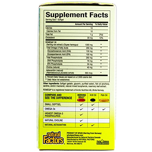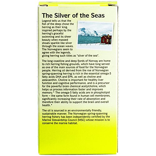 Studio : Natural Factors Publisher : Natural Factors Binding : Health and Beauty Product Description Herring Gold from the Silver of the Sea Legend tells us that the fish of the deep chose the herring as their king, inspired perhaps by the herring's graceful swimming and its sheer beauty when massed shoals sparkle like silver through the ocean waves. The Norwegians seem to agree with the legends, giving herring such titles as "silver of the sea". The long coastline and deep fjords of Norway are home to rich herring fishing grounds, which have long served as one of the main sources of food for the Norwegian people. Herring oil derived from the roe of Norwegian spring-spawning herring is rich in the essential omega-3 fatty acids DHA and EPA, as well as choline and astaxanthin. Choline is important for healthy liver function and cognitive performance, and is a precursor for the powerful brain chemical acetylcholine, which helps us process information faster and supports memory. The omega-3 fatty acids are in phospholipid form - the same form found in human cell membranes, significantly increasing their rate of absorption and therefore their ability to support the brain and overall health. The oil is sourced in an environmentally friendly, sustainable manner. The Norway spring-spawning herring fishery has been independently certified by the Marine Stewardship Council (MSC) whose mission is to conserve the marine habitat. 0