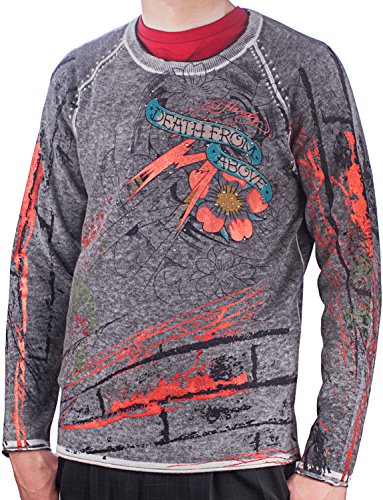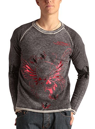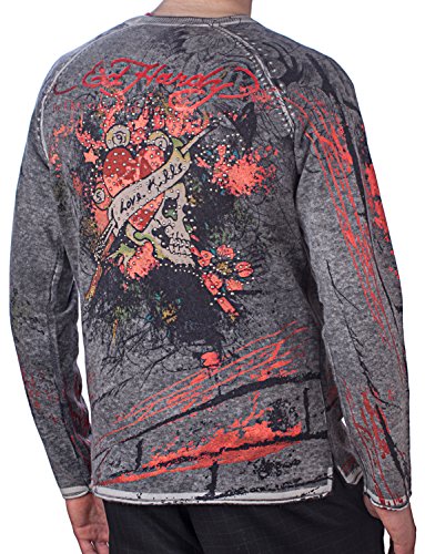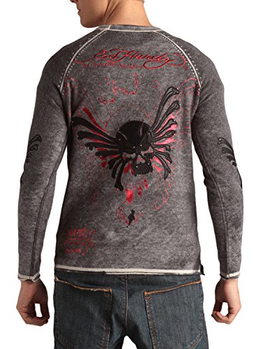 Product Description This Ed Hardy Mens Studded Sweater Features: Stonewash Fabric giving it a soft comfortable fit, Ribbed Collar, front and back Metallic foil Grafiti design with Rhinestone Stud and leather details. 0
