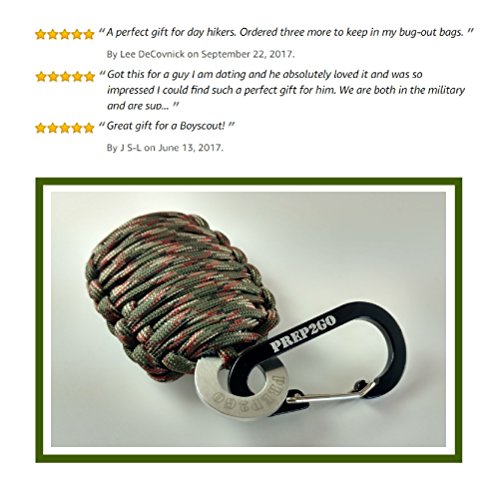 Our Motto-'Always be prepared, PREP2GO'. "I won't bore you with more product details. But let me tell you my story for starting my disaster preparedness company. "In 2004, I moved our family from MI to Florida, of course for the better weather. BOY were we in for a surprise! Within months of arrival, not one but TWO hurricanes named Francis/Jeanne walloped our PSL Treasure Coast home. After evacuation we were awe struck by the devastated neighborhood. Thankfully our home survived. Our desire to help others in this great hour of need moved my wife and I to volunteer as non cert team first responders to ride out storm 2 Cat3-120mph winds brewing off the coast. Our house stood its ground. We were spared much heartache...Many others weren't. So we spent the next year doing hurricane relief at no cost, helping our neighbors rebuild their lives one roof at a time. Out of the emergency grew a vigilant drive for family safety to prep for future adventure. So began my search for premium products...and voila my black king cobra weave paracord survival 'grenade' kits...and soon other cool everyday carry gadgets, quality gift ideas and safety hacks to help you with preppers supplies for bug out bags so you're stocked fully prepared when disasters strike."...Owner, Tim...Who are my 'Verified Customers'? Maverick Appalachian trail trekker guy, Mother (teen son), Wild off road atv gal, Wife gifts husband, Retired usaf father to 6 kids:sons, daughter, Iraq war vet army ranger preps tactical military survival gear kit, Travel mom (military police) boys graduation, Vacation getaway camper couple, Day trip backpacker boyfriend, Survivalist shtf edc kit, Doomsday walking dead survival preppers family, US marines semper fi serviceman, Walleye dad fisherman - fishing hunting trips, Army Vietnam veteran, Hobbyist uncle grigri belay device, Boy scouts of america troop leader, Girlfirend policeman fireman gifts.Feature