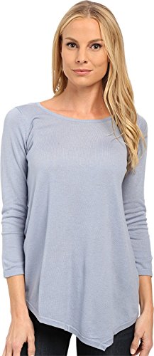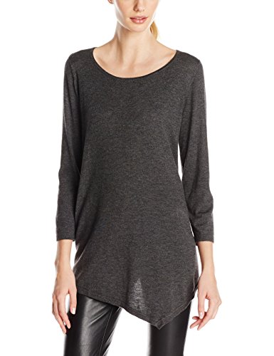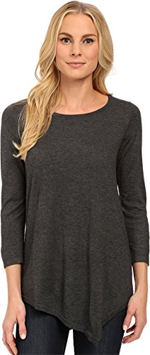 Features a scoop neck, 3/4 sleeves and asymmetrical hemline