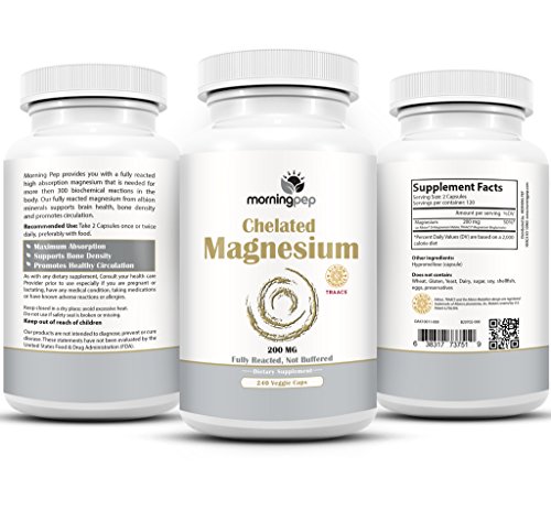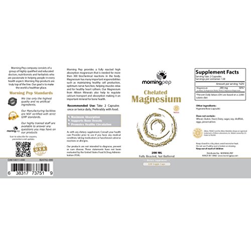 -. Binding : Health and Beauty -. Brand : Morning Pep -. EAN : 0638317737519 -. Feature : Morning Pep Chelated Magnesium 240 Vegetarian Caps Is Backed By A 90 DAY SATISFACTION OR MONEY BACK GUARANTEE, Purchase With Confidence Knowing That We Only Source The Absolute Best Quality Ingredients Available On The Market / Morning Pep Chelate Magnesium Supplement In A Vegetarian Caps Is Fully Reacted "not buffered" meaning that is it not mixed with less expensive and less absorbable magnesium oxide, Made with TRAACS a patented form of bioavailable magnesium that is chelated is one of the best absorbed forms of magnesium to optimize bioavailability And Has clinically shown to be four times more effective than its inferior counterparts, / Morning Pep Ensures That Our Chelate Magnesium is 100% fully reacted And Completely Pure. There Are No Fillers Such as Silicon dioxide Or Magnesium stearate or Or GMO Artificial Ingredients Or Preservatives. It is Also Free of Soy Gluten Milk Egg Corn or Wheat. / Morning Pep Chelate Magnesium Supplement supports bone density, promoting relaxation of muscles, reducing the frequency of leg cramps, helps maintain a normal regular heartbeat and supports overall cardiovascular health And energy production / Morning Pep Chelate Magnesium Are Manufactured And Packaged In The USA In a FDA And GMP Approved Facility for purity and potency -. IsAdultProduct : 0 -. Label : Morning Pep -. Manufacturer : Morning Pep -. MPN : 3751 -. PackageQuantity : 1 -. PartNumber : 3751 -. ProductGroup : Health and Beauty -. ProductTypeName : HEALTH_PERSONAL_CARE -. Publisher : Morning Pep -. Size : 240 -. Studio : Morning Pep -. Title : Magnesium Bisglycinate Chelate 240 Vegi Caps 200mg Elemental per Serving, Our fully reacted (TRAACS) Albion Magnesium Has The Highest Level of Absorption, Helps function muscles bones and the heart -. UPC : 638317737519