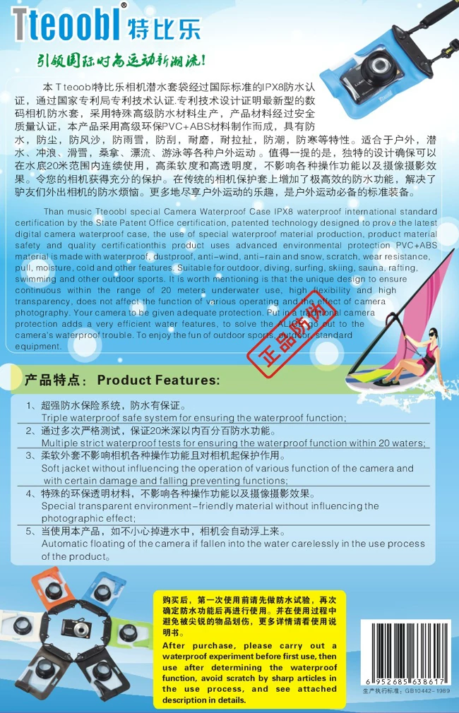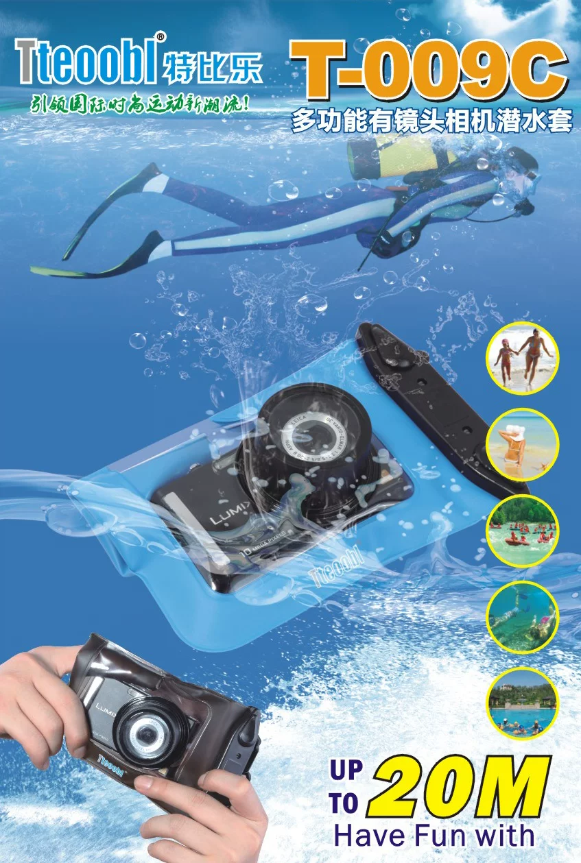 "Tteoobl special than music," the world's first digital camera waterproof case. Using high-quality materials Polyvinylchloride, not only has excellent high-tension high tension ﹑ ﹑ tough and anti-aging properties, and is the kind of mature green material with high strength, good toughness, wear resistance, cold resistance, oil resistance, hydrolysis resistance, aging and weathering, at minus 35 degrees still maintain good elasticity, flexibility and other physical properties, outstanding impact resistance and shock absorption properties and other fine features. He has many high waterproof breathable anti ﹑ cold wind ﹑ ﹑ ﹑ antibacterial mold ﹑ ﹑ UV and thermal energy release and other outstanding features. Product features dustproof, waterproof, anti-wind, rain and snow, suitable for outdoor sports, beach, pool, rainy day, shooting underwater use, usually using the camera also allows you to be fully protected, and can enjoy the water shooting fun is necessary standard equipment for outdoor sports.