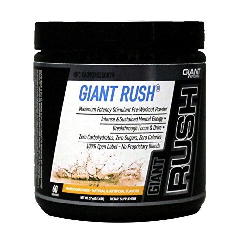 ReleaseDate : 2016-07-30 Studio : Giant Sports International Publisher : Giant Sports International Binding : Health and Beauty Product Description Giant RUSH - Mango Madness Flavor! GIANT RUSH is the ultimate stimulant and fat burning catalyst for maximum mental energy and weight management. Specifically designed to maximally enhance focus, clarity and metabolic rate via its hyper potent stimulant system, Giant Sports is once again revolutionizing what educated athletes crave everywhere. Giant Sports cutting edge, triple action system found in Giant Rush means that in addition to the mind-boggling energized body feel generated from GIANT RUSH you can expect to feel immediate and long lasting mental energy, intense motivation, unrivaled focus and unparalleled appetite suppression. GIANT RUSH's unique formula does all this without the annoying "crash" that other high-stimulant products often cause. Conveniently available in cans of 60 servings. 0