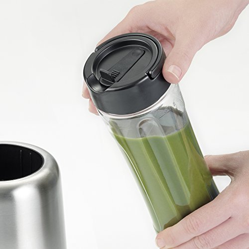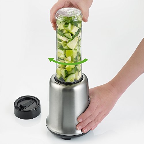 Mixer und Trinkbehalter in Einem: das Edelstahlmesser einfach durch den Deckel ersetzen und fertig ist der Smoothie to go fur unterwegs, im Buro oder beim Sport