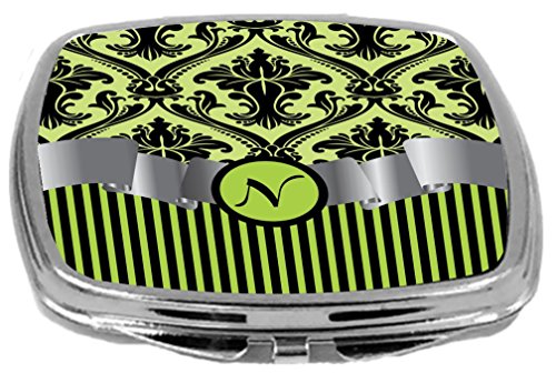 Rikki Knight Compact Mirror, Letter n Initial Lime Green Damask and Stripes