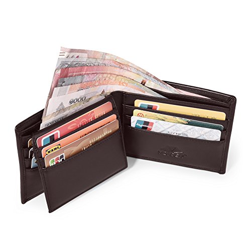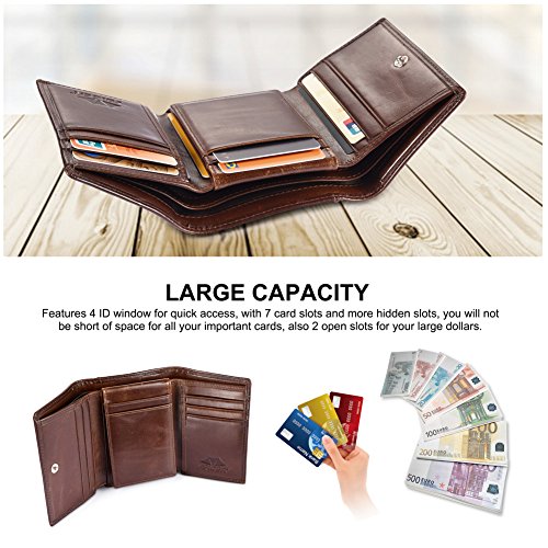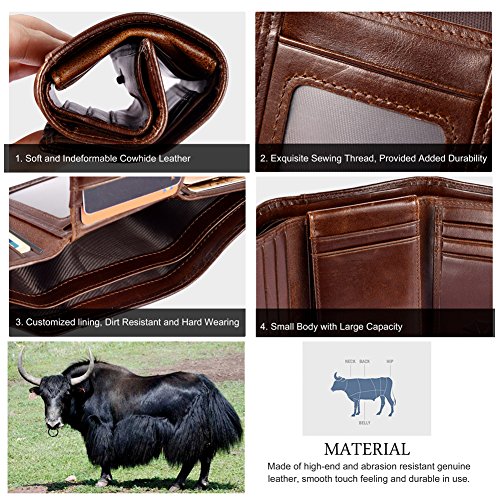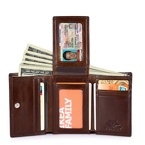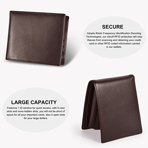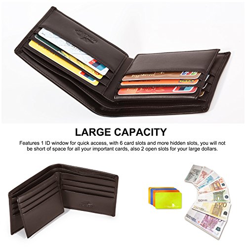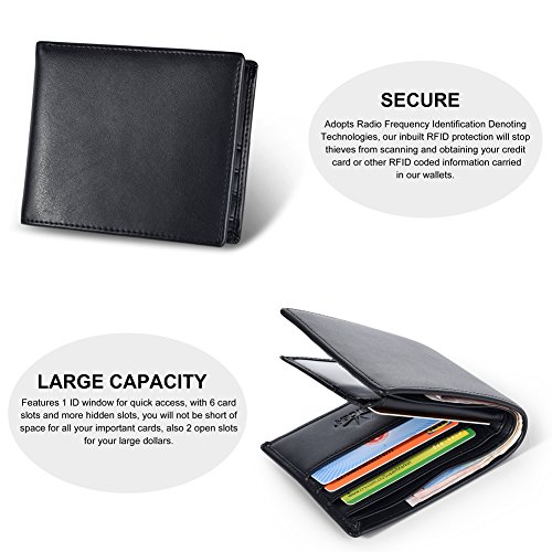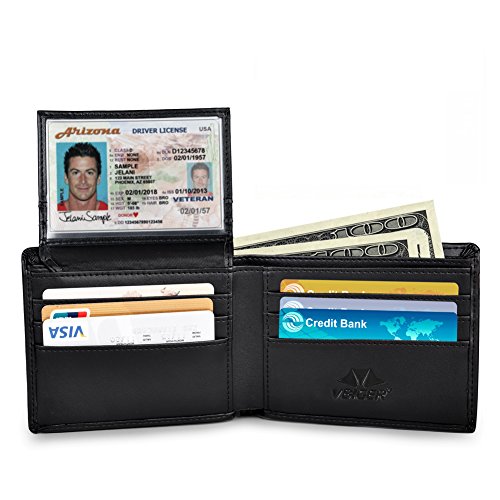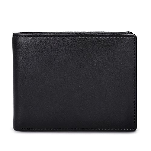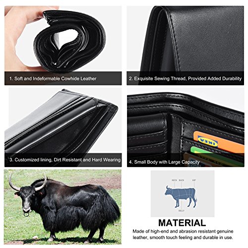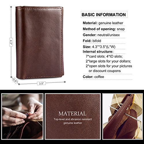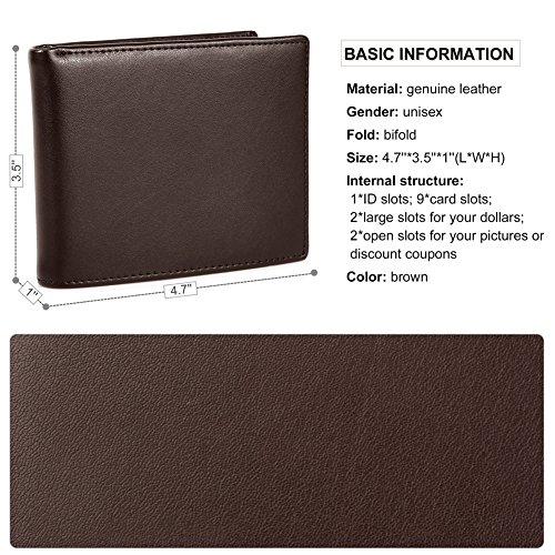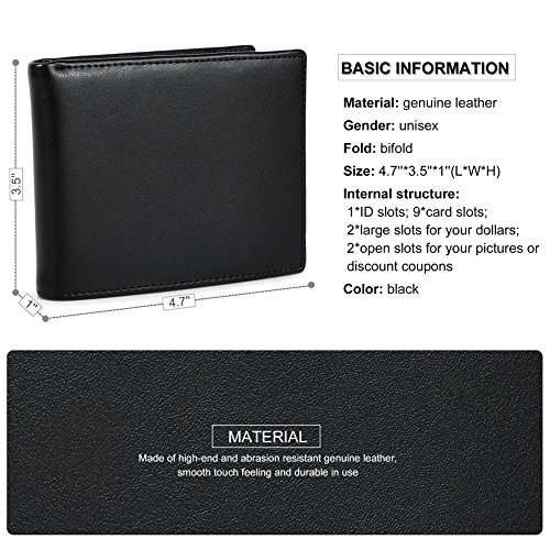 Feature Material: genuine leather Gender: unisex Fold: bifold Size: 4.7'*3.5'*1'(L*W*H) Internal structure: 1*ID slots; 9*card slots; 2*large slots for your dollars; 2*open slots for your pictures or discount coupons Color: black