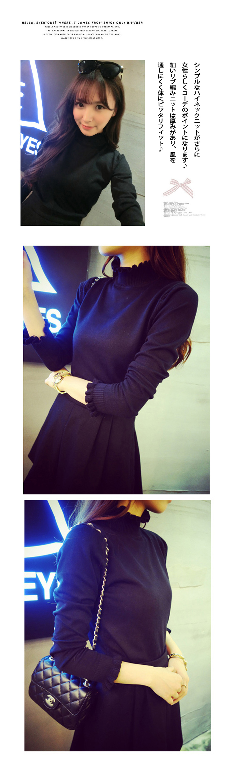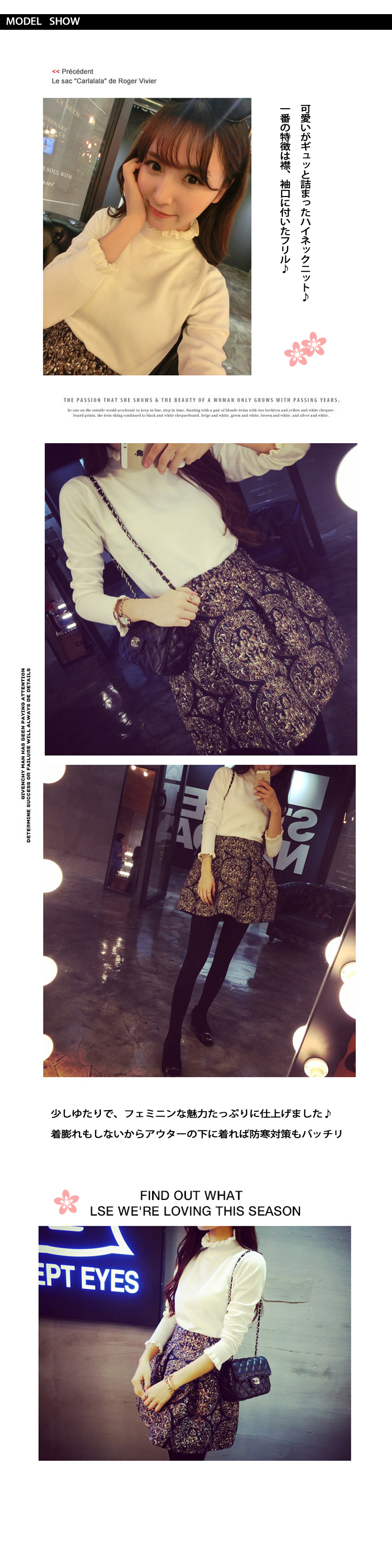 | 可愛いがギュッと詰まったハイネックニット?一番の特徴は襟、袖口に付いたフリル?シンプルなハイネックニットがさらに女性らしくコーデのポイントになります?細いリブ編みニットは厚みがあり、風を通しにくく体にピッタリフィット?少しゆたりで、フェミニンな魅力たっぷりに仕上げました?着膨れもしないからアウターの下に着れば防寒対策もバッチリ | |