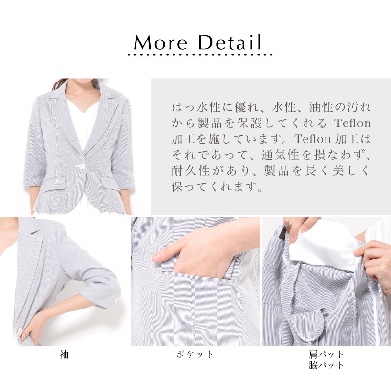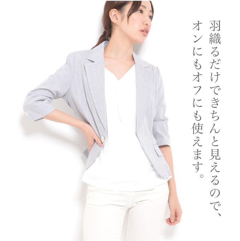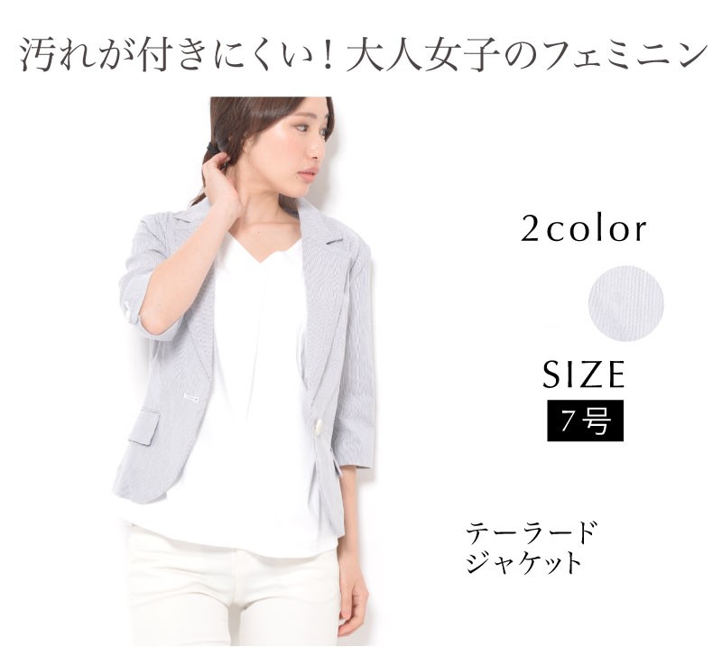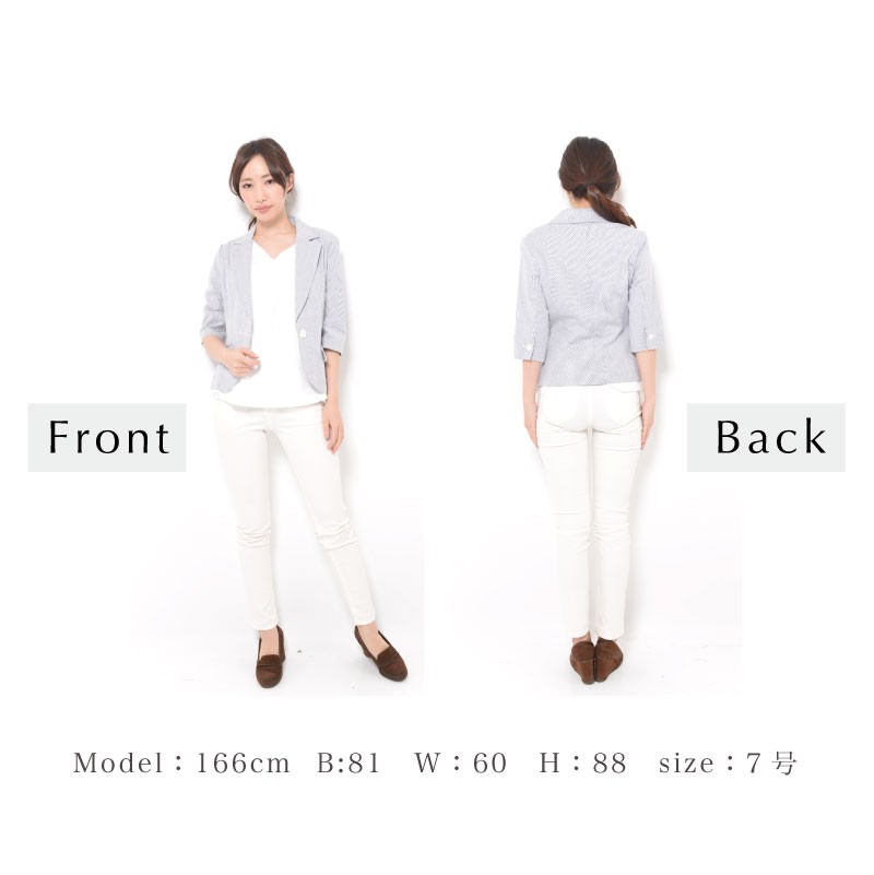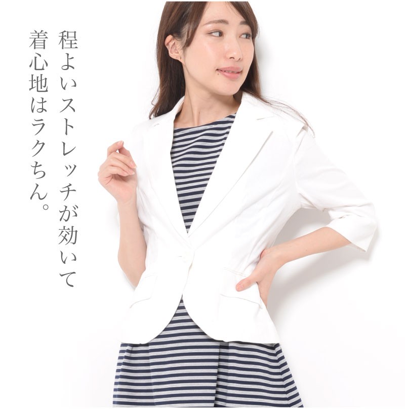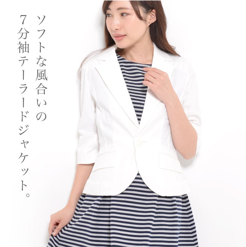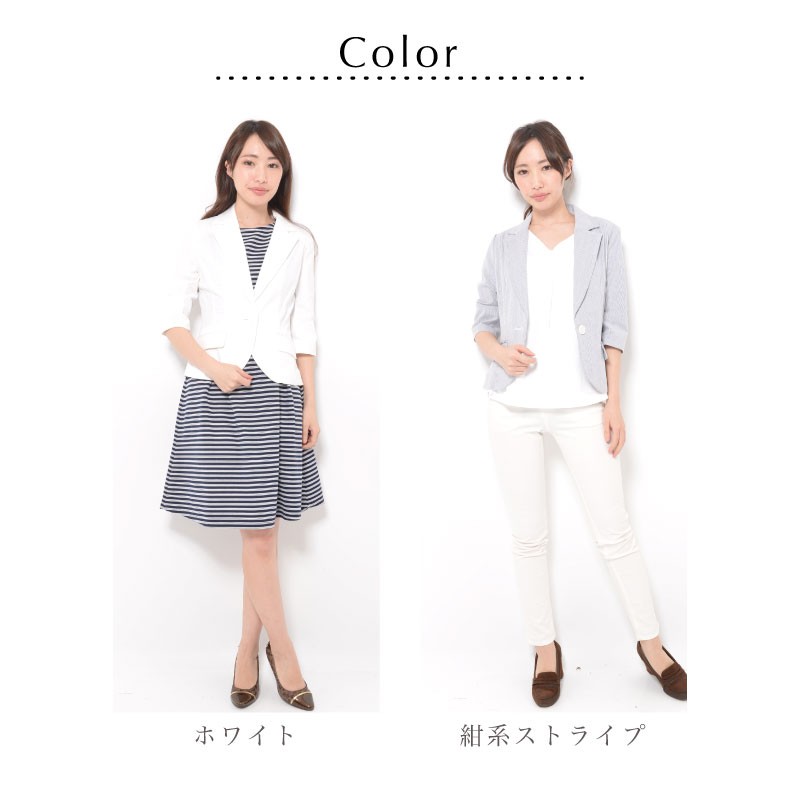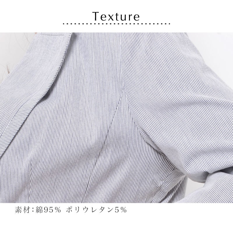 バスト88(80) ヒップ(89) 着丈55 袖丈38 肩幅38 ※(紺系ストライプ)商品により柄の出方が異なる場合があります。 ●肩パット付き (前)左右ポケット | | 素材 | 綿95% ポリウレタン5% | | 生産国 | 中国 | | 裏地 | なし | | 生地の伸縮 | なし | | 生地の透け感 | なし | | カラー | 01. ホワイト 02. 紺系ストライプ | | 注意点 | ▼綿混合商品は洗濯時に多少縮む事がございます。 ▼パソコン、モニター等の環境により、実際の商品素材カラーが多少異なる場合が御座います。予めご了承ください。 ▼お手数ですが必ずお買い物ガイドを一読頂いてからご利用いただきますようお願い申し上げます。 | |