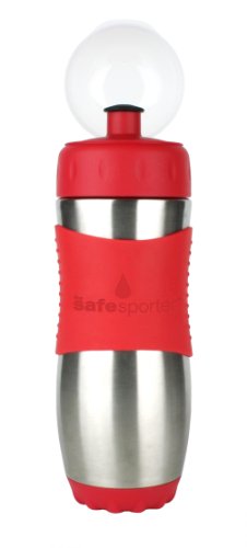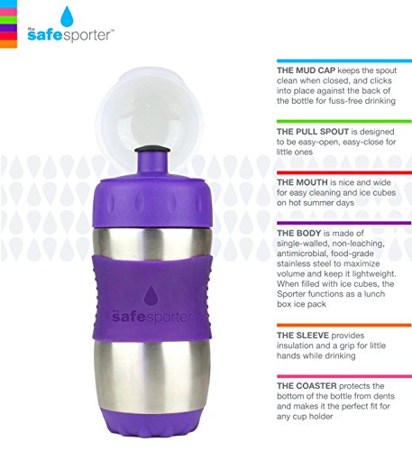 The safe sporter water bottle is made from clean, non leaching stainless steel. The bottle is tested free of BPA, phthalates and other harmful chemicals. The safe sporter features a single walled design to maximize volume, a wide mouth for easy cleaning and ice cube use, an easy pull sports top spout, a removable mud cap to keep the spout clean, a colorful waistband to protect hands from cold liquids and a coaster to protect the bottle from dents. The safe sporter is dishwasher safe.