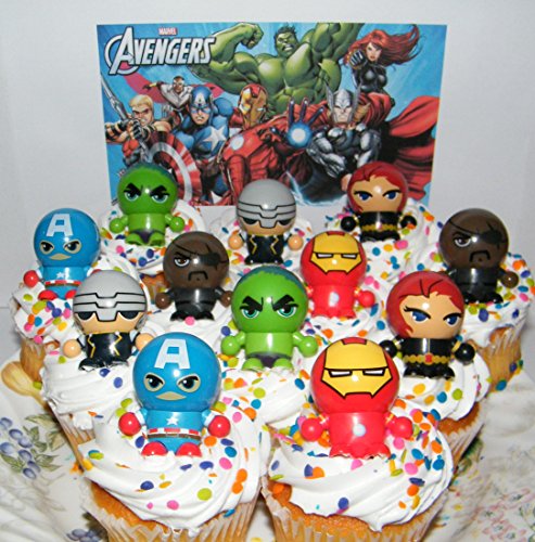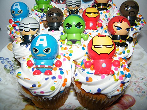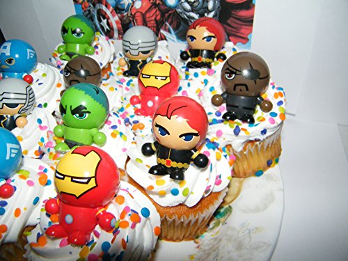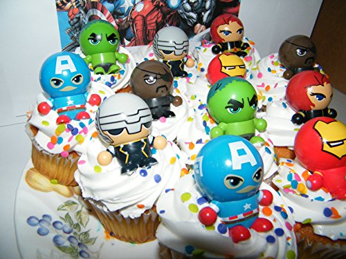 Marvel Avengers Super Hero Deluxe Mini Cake Toppers Cupcake Decorations Set of 12 Fun Figures with neat Bouncy Ball Switchable Heads includes the Hulk, Iron Man Etc.