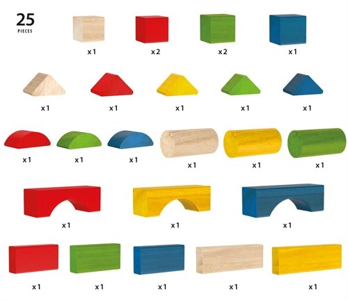 -. Feature : Dieses Set beinhaltet 25 bunte Holzbausteine in 7 verschiedenen Formen die einladen zum Bauen und Gestalten. / Dieses Set beinhaltet 25 bunte Holzbausteine in 7 verschiedenen Formen.