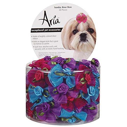 -. Binding : Misc. -. Brand : Aria -. EAN : 0721343363873 -. Feature : Made of sheer ribbon in deep jewel tones with a petite rose in the center / Each 1-5/8" bow attaches easily with a rubber band backing / These elegant bows are perfect for formal occasions / Canister of 48 pieces -. Label : Aria -. Manufacturer : Aria -. Model : DT1108 48 -. MPN : DT1108 48 -. NumberOfItems : 1 -. PackageQuantity : 1 -. PartNumber : DT1108 48 -. ProductGroup : Pet Products -. ProductTypeName : PET_SUPPLIES -. Publisher : Aria -. Size : Not Applicable -. Studio : Aria -. Title : Aria Sunday Rose Bows for Dogs, 48-Piece Canisters -. UPC : 721343363873