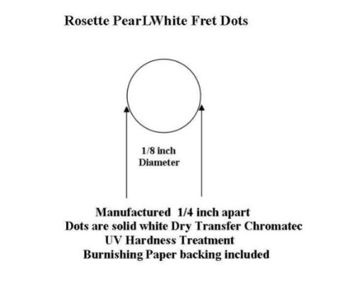 Studio : Rosette Publisher : Rosette Product Description Rosette Premium Fret Marker Dots are manufactured with a durable material known as Dry Transfer Chromatec. The dots are applied by a burnishing method, similar to a rub on decal. The color dry transfer contains no sticky adhesives and attaches to the guitar neck with a low profile. Rosette Fret Dots can also be used over existing inlaid fret dots for a new fresh look.