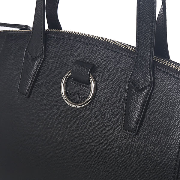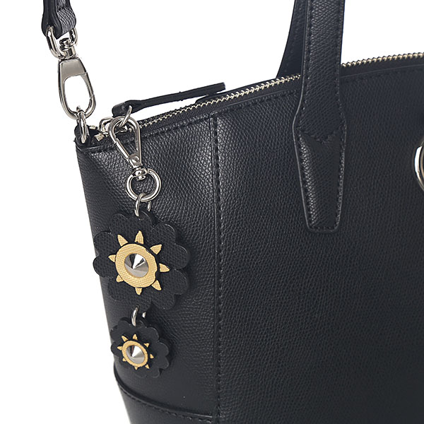 외부수납:~ 중 사이즈의 토트백 앞면에 오링 장식으로 디테일하게 포인트를 주었고 꽂무늬가 이중으로 겹쳐진 타슬 부착 사용감이 편하도록 탑지퍼 오픈형 구조로 실용성이 좋고 스크래치에 강한 소재로 내구성이 높음 |