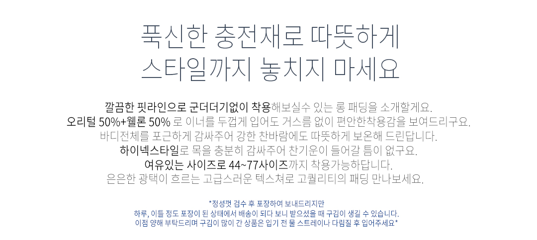 폴리(polyester/)100%안감폴리(polyester/)100%충전재오리솜털(duckdownyhair/)50%+웰론(wellon/)50%
